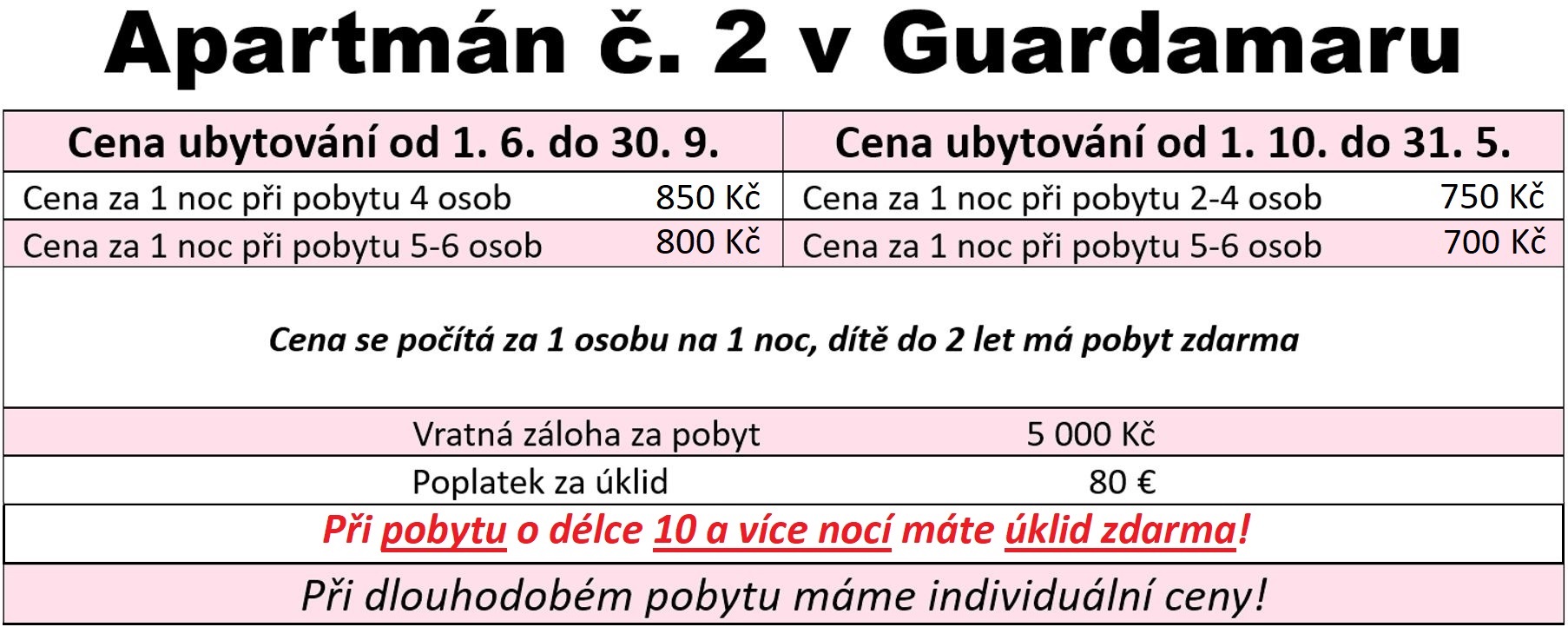 Poplatek za úklid apartmánu č. 1 činí 60 € a za úklid apartmánu č. 2 činí 80 €.